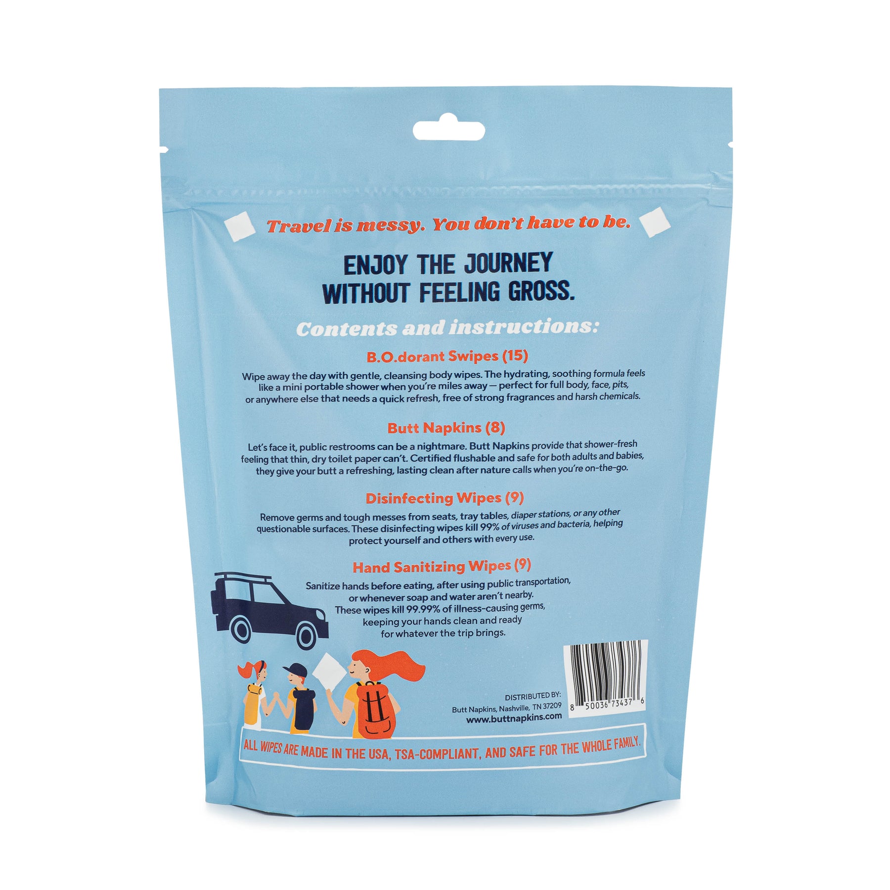 Whether it’s a red-eye, road trip, or family free-for-all, this kit keeps everyone feeling fresh from gate to gate. With wipes for body, butts, hands, and surfaces, it’s your all-access pass to cleanliness wherever travel takes you.